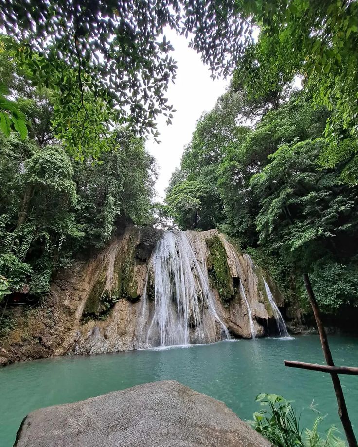 “A hidden waterfall surrounded by lush greenery and natural pools”